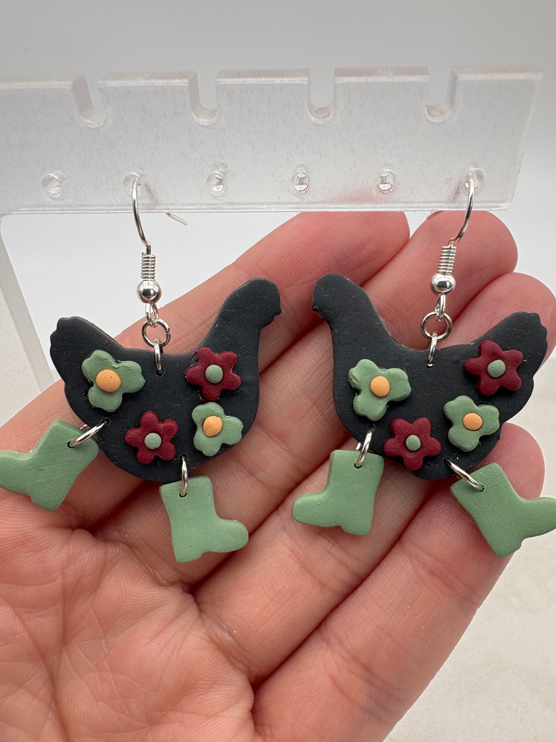 Add a dash of whimsy to your look with these black chicken earrings featuring a floral design and forest green rain boots. Perfect for those who love unique accessories, these earrings bring a fun vibe to any outfit while showcasing your love for creative style!