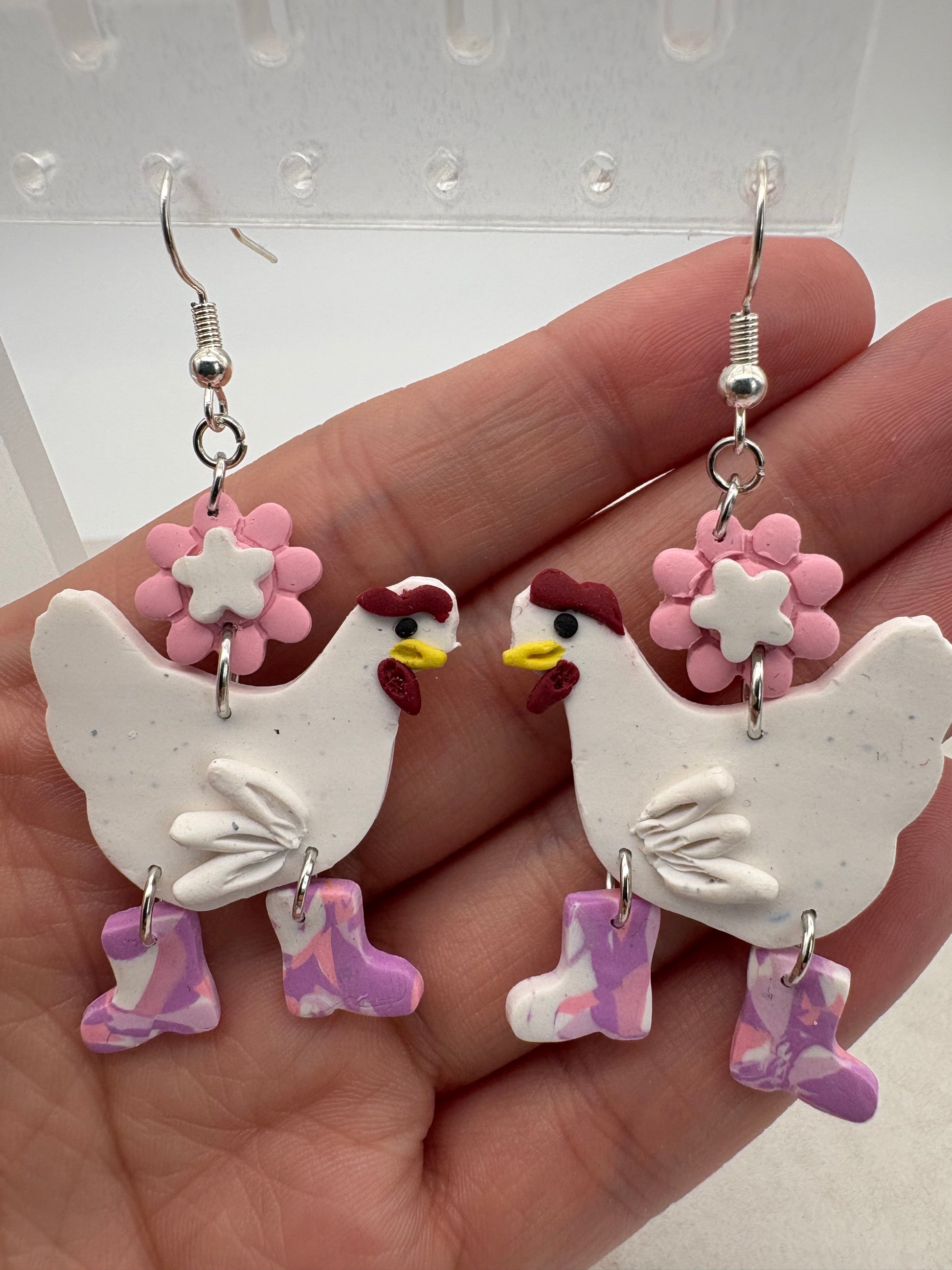 These charming Foghorn Leghorn chicken earrings feature a playful design with rain boots decorated in a pink, purple, and white pattern, accented by a pink and white flower. Lovingly crafted, they offer a unique blend of whimsy and style, making them a standout accessory. Lightweight and vibrant, these earrings add a fun touch to any outfit!