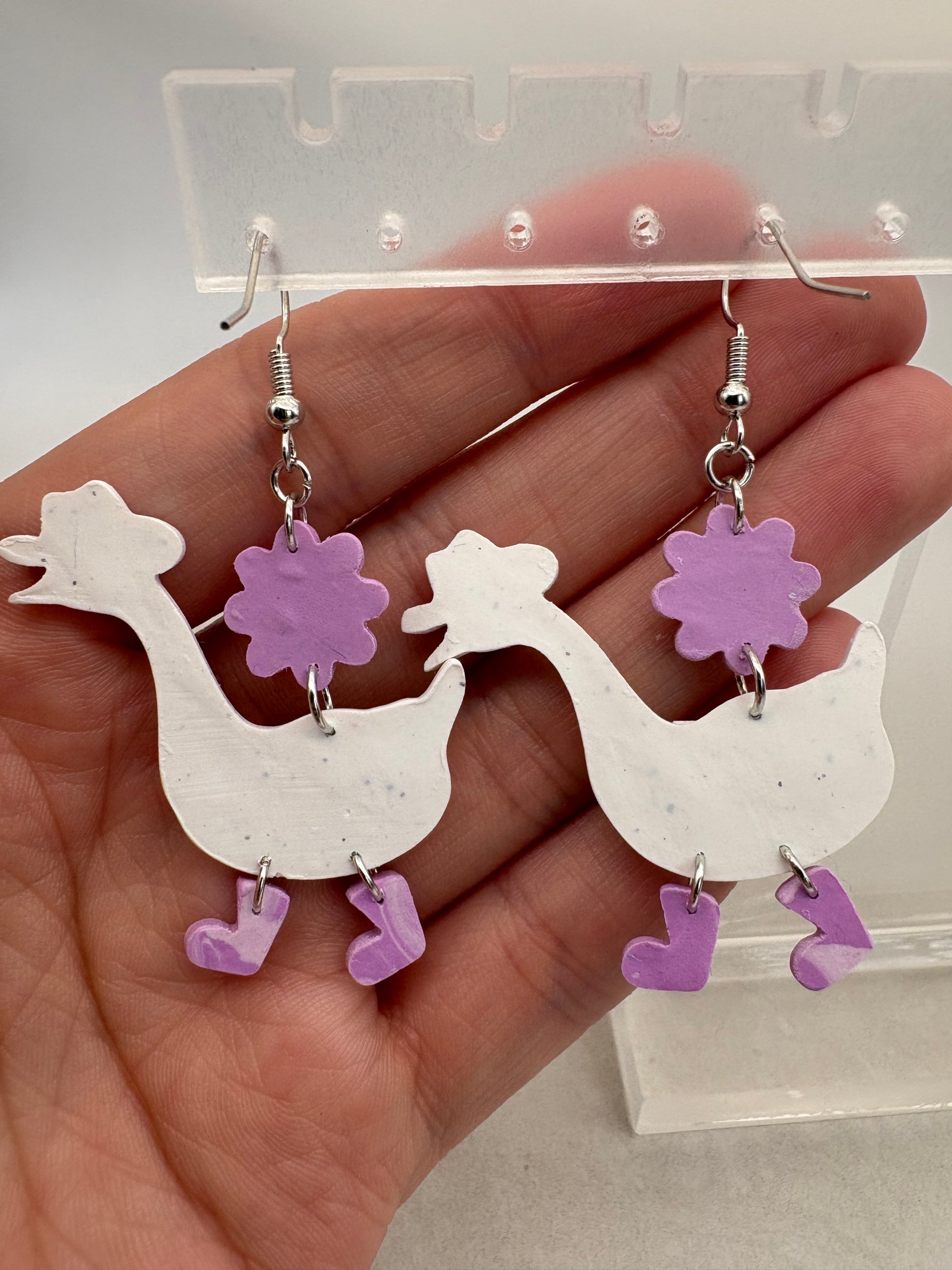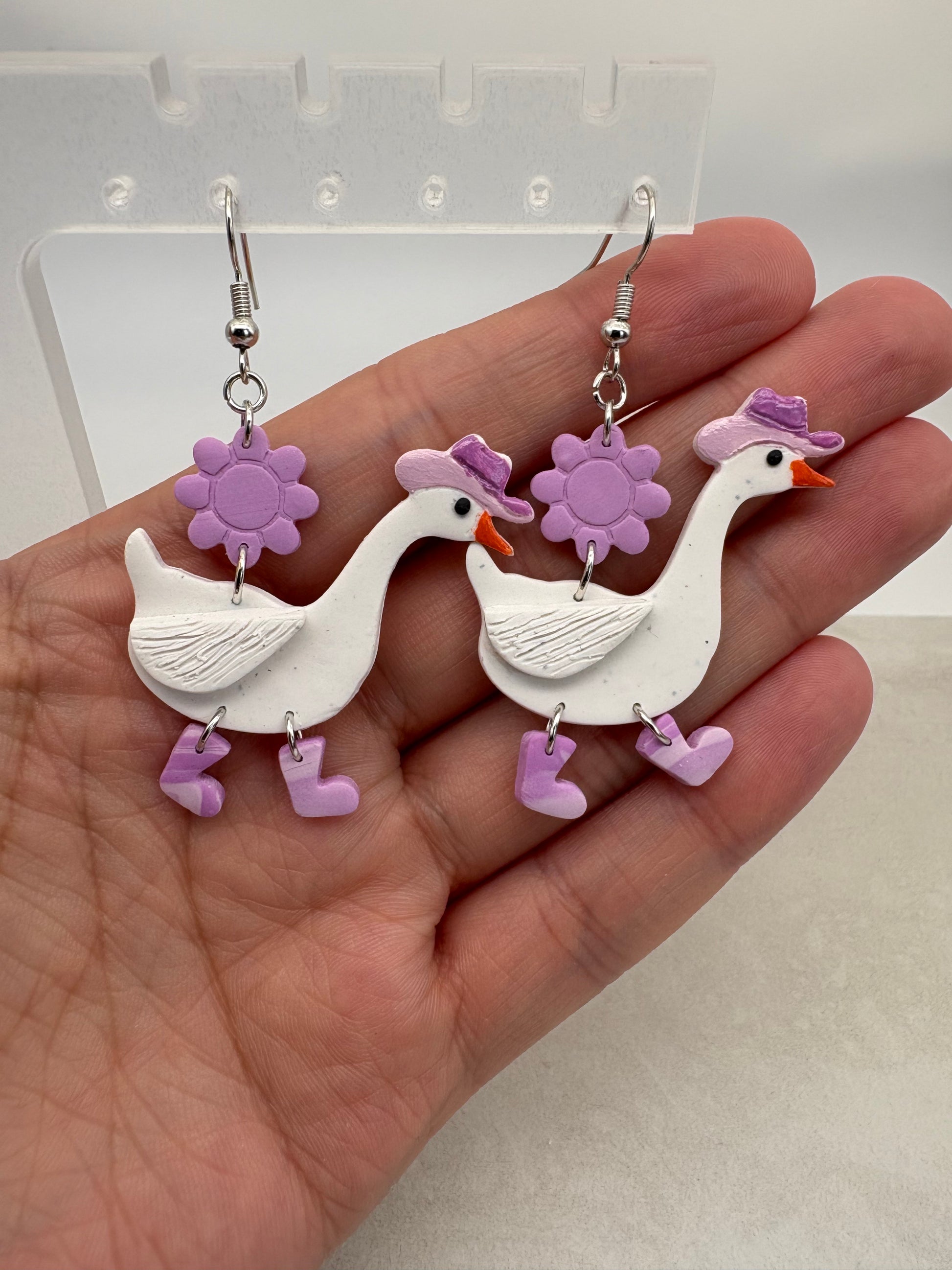 These lovingly crafted earrings feature a playful pair of geese dressed in a purple cowboy hat and purple boots, each accented with a vibrant purple flower. Combining whimsical charm with unique design, they offer a distinctive accessory that brings a touch of personality and style to your collection.